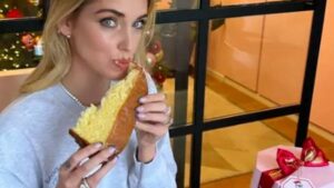 Chiara Ferragni mentre mangia una fetta del Pandoro griffato