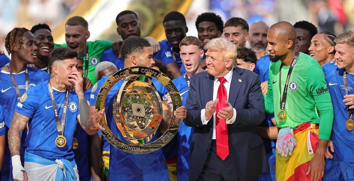La scena l’ha vista tutto il mondo. Il capitano del Chelsea Reece James pronto ad alzare la coppa del mondo per club, la squadra poco dietro, febbrile, in attesa di iniziare i caroselli post vittoria. Nel mezzo, tra le casacche blu del team londinese, spiccano dei capelli biondi e una cravatta rossa. Donald Trump è lì con loro a festeggiare. Il tycoon batte le mani e sorride con sguardo sornione, mentre i giocatori lo guardano con incredulità e un po’ di imbarazzo.