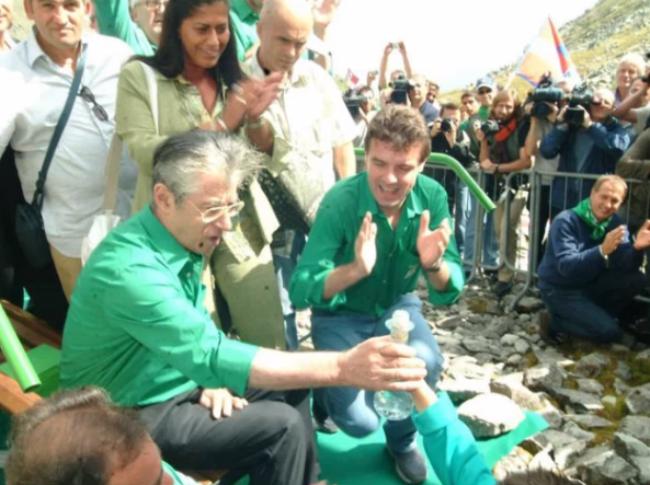 È stato lui ad introdurre nel dibattito politico il termine Padania, territorio che corrisponde alla pianura padana il cui re, Bossi per l’appunto, segnava i confini ogni anno. Lo chiamava il “rito dell’ampolla”. Era il 13 settembre 1996 quando il leader dell’allora Lega Nord sollevava al cielo per la prima volta l’ampolla con l’acqua appena prelevata dalla sorgente del Po, sul Monviso. Forgiata apposta da un vetraio di Murano e custodita da due militanti in camicia verde. Poi il viaggio, dal Piemonte fino a Venezia. Dove l’acqua del “dio Po” è versata dalla Riva degli Schiavoni in occasione della Festa dei Popoli Padani. Un rito, a metà tra la performance teatrale e il pagano, ripetuto religiosamente ogni anno fino al 2003.