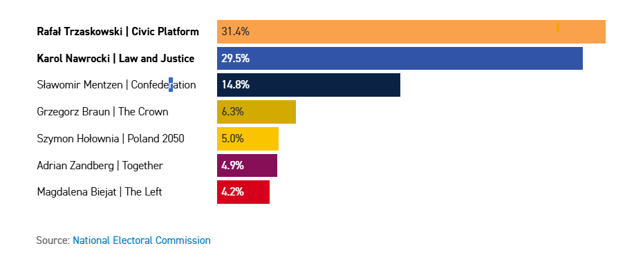 È il liberale Rafal Trzaskowski, già sindaco di Varsavia, a vincere il primo turno delle elezioni presidenziali polacche. Il candidato centrista ed europeista, membro del partito Piattaforma Civica dell’attuale primo ministro Donald Tusk, ha ottenuto il 31.3% delle preferenze. Una vittoria di misura sul 29.5% di Nawrocki, candidato di Ordine e Giustizia, il partito populista e sovranista polacco.