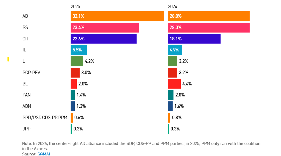 La coalizione di Luís Montenegro ha raggiunto il 32% delle preferenze, portando l’Alleanza Democratica a controllare 89 seggi in parlamento, lontani dai 116 necessari per la maggioranza.
